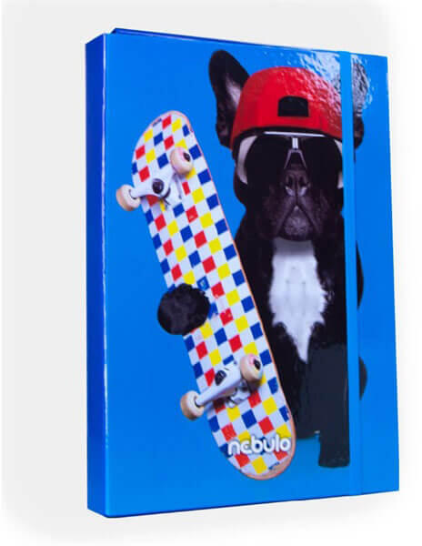 A4-es méretű füzetbox mókás gördeszkás bulldog képpel díszítve.  Kiválóan alkalmas füzetek, tankönyvek tárolására.